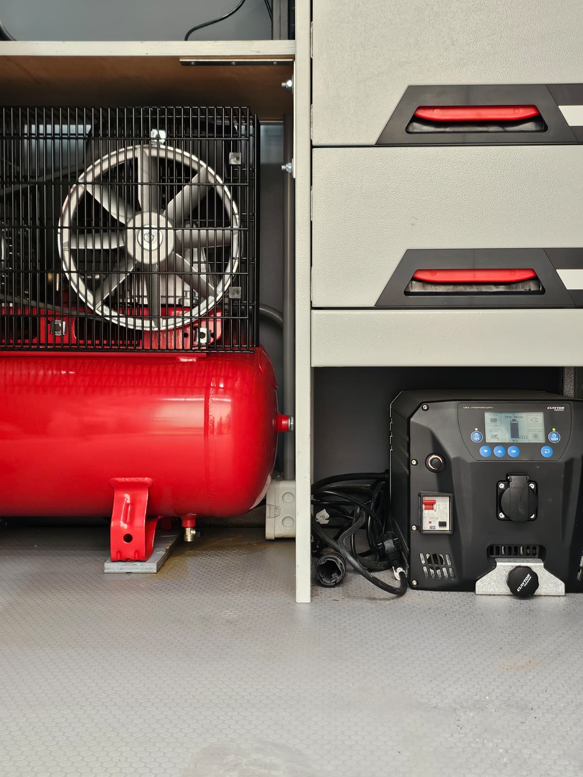 Omdat er op locatie niet altijd stroom of luchtaansluiting is, is de bus hier speciaal op aangepast. Zo kunnen we altijd en overal aan de slag.